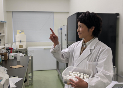 研究員は計3人のチームで仕事をしています。明るく元気な女性で頭の回転が速く、アイデアを出し、試すタイプやじっくり派で冷静に自分なりの考えを述べて方向修正に必要なことを気づかせてくれるなど、チーム内でそれぞれの良さを生かして仕事をしています。また、業務の関係で開発部や品質管理、製造、営業部等、社内の他部署の方や外部の大学の先生や研究機関に協力をお願いすることもあり、研究所内だけでなく様々な方々と関わりながら仕事をしています。