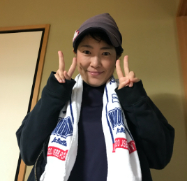 写真:息子の少年野球のチームタオルを持って