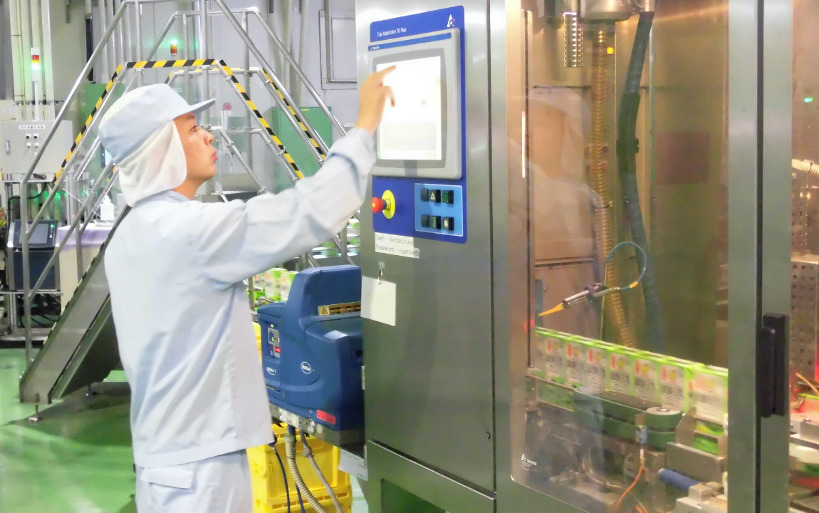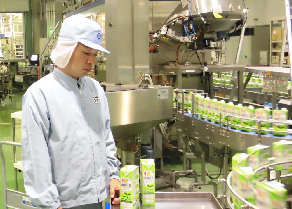 豆乳飲料でテトラパック200ml、1000mlラインの製造オペレーターとして、豆乳製品のケース梱包作業の業務を、入社してから変わらず担当しています。